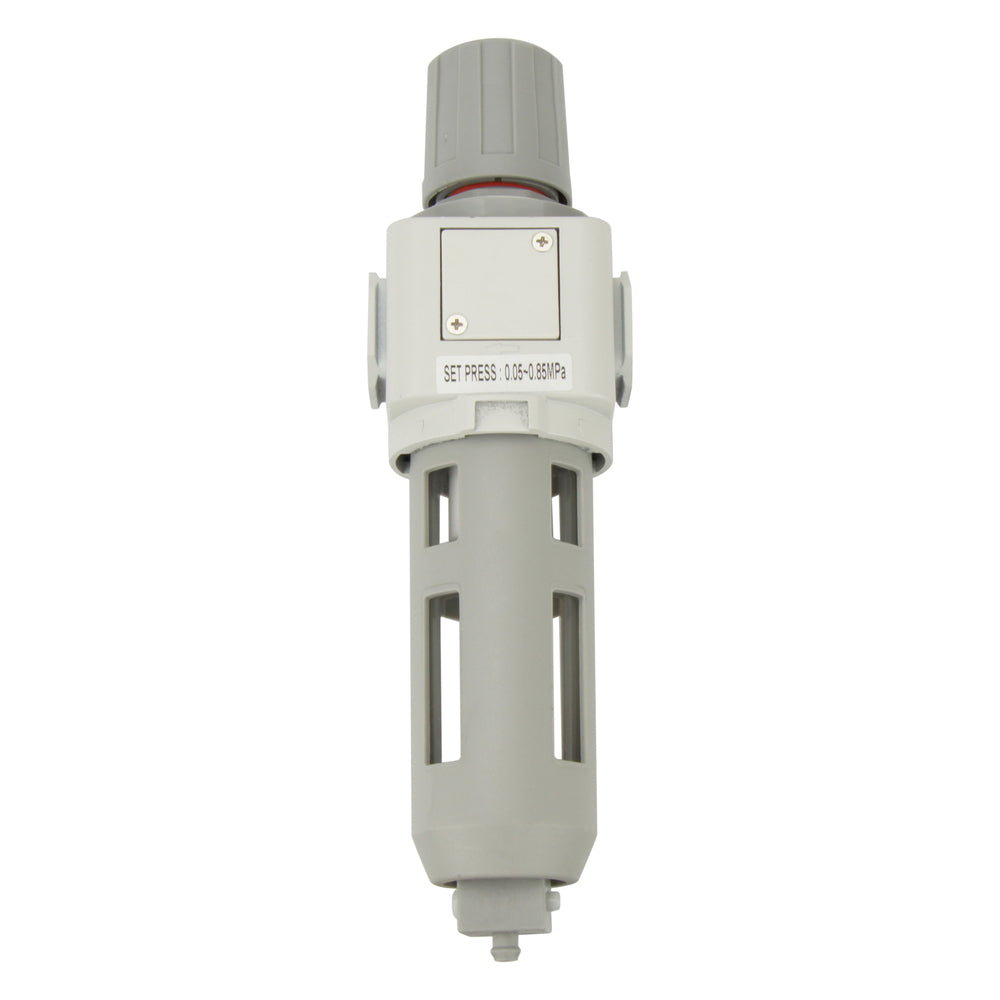 Ce filtre régulateur pneumatique G1/4" de haute qualité (FR) élimine l'humidité et les contaminants de plus de 5 μm et régule la pression de sortie entre 0,5 et 8,5 bar. Comprend un manomètre. Le débit maximum est de 1200 l/min (toujours utiliser le diagramme de débit pour un dimensionnement correct). La vanne de vidange semi-automatique s'ouvre à chaque fois que l'air comprimé est coupé. Convient pour une entrée maximale de 10 bars et des températures comprises entre -5 et 60 °C. Pour régler la pression de sortie, tirez le volant vers le haut et tournez-le. Verrouillez en repoussant la roue. Comprend un support de montage.