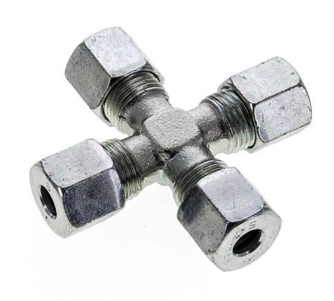 Ce raccord à vis croisé est conçu avec quatre orifices de raccord à bague coupante en forme de croix. Le raccord 1 est une bague coupante de 8 mm. Le raccord 2 est une bague coupante de 8 mm. Le raccord 3 est une bague coupante de 8 mm. Le raccord 4 est une bague coupante de 8 mm. Il est fabriqué en acier et est plaqué en zinc galvanique/électrolytique pour protéger la surface. Il convient aux milieux situés dans une plage de températures allant de -40 °C à 120 °C (-40 °F à 248 °F). À 20 °C (68 °F), il peut supporter une pression maximale de 630 bars (9138 psi). Selon la norme DIN 2353, il est classé dans la catégorie de charge S (lourde). Il est fabriqué conformément à la norme DIN EN ISO 8434-1 (DIN 2353).