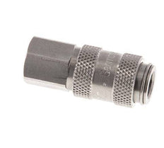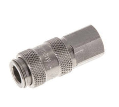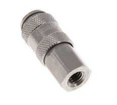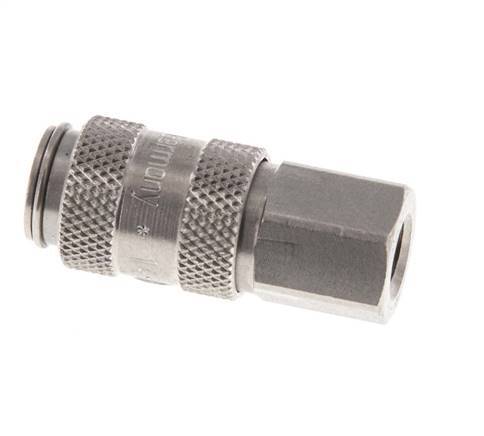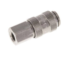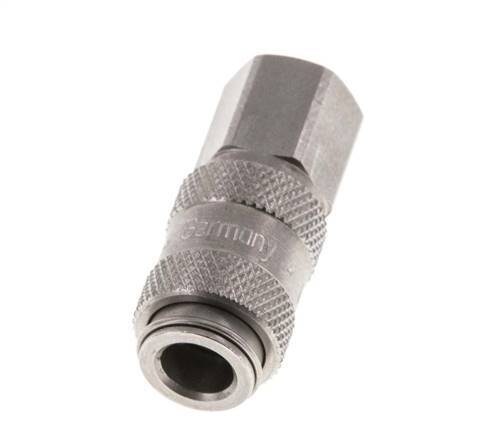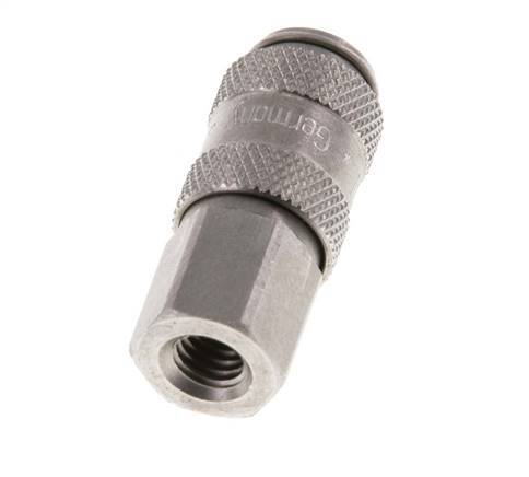 Manchon d'accouplement à air DN 2.7 (micro) en acier inoxydable avec filetage femelle M5. Un raccord pneumatique est utilisé pour connecter des outils à air comprimé à une ligne d'air comprimé. Le raccord nécessite deux parties : la douille (partie femelle) et la fiche ou le mamelon (partie mâle). Lorsqu'il est déconnecté, le raccord s'arrête automatiquement pour maintenir la pression de la ligne.