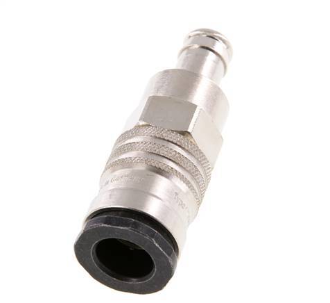 Prise d'accouplement d'air DN 10 en acier/laiton avec un raccord de colonne de tuyau de 13 mm. La plage de pression de fonctionnement est comprise entre 0 (convient pour les vides grossiers) et 35 bar. Convient pour des températures comprises entre -20 et 100 degrés Celsius. Le débit est de 3600 l/min. Le matériau des joints est le NBR (caoutchouc nitrile).