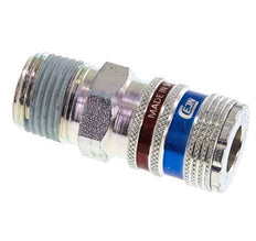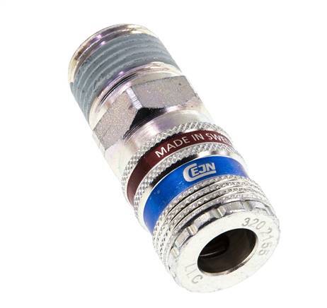 Manchon d'accouplement à air de sécurité en acier/laiton DN 7.6 (compatible avec le profil Euro DN 7.2) avec filetage mâle R 1/2 pouce. Un raccord pneumatique est utilisé pour connecter des outils à air comprimé à une ligne d'air comprimé. Le raccord nécessite deux parties : la douille (partie femelle) et la fiche ou le mamelon (partie mâle). Lorsqu'il est déconnecté, le raccord s'arrête automatiquement pour maintenir la pression de la ligne.