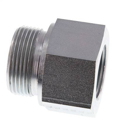 Cette réduction filetée en acier est conçue avec des filets mâles et femelles cylindriques. Le raccord 1 a un filetage mâle G 1 1/4 pouce. Le raccord 2 a un filetage femelle G 1 pouce. Le joint est en élastomère. Pression maximale de 400 bar (5802 psi).