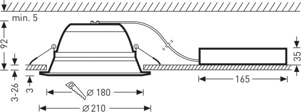 Downlight LED encastré professionnel avec une sortie de 1900lm à 106 lm/W d'efficacité. Comprend un réflecteur hautement spéculaire avec une distribution de faisceau symétrique étroit. Caractéristiques de lumière blanche chaude 3000K, CRI>80 et diffuseur prismatique PMMA. Évalué pour 25 000 heures de durée de vie L80 avec source LED remplaçable et équipement de contrôle. Installation via fixation à ressort dans des découpes de plafond de 180-195mm. Classé IP20/IP44 avec protection contre les chocs IK02.
