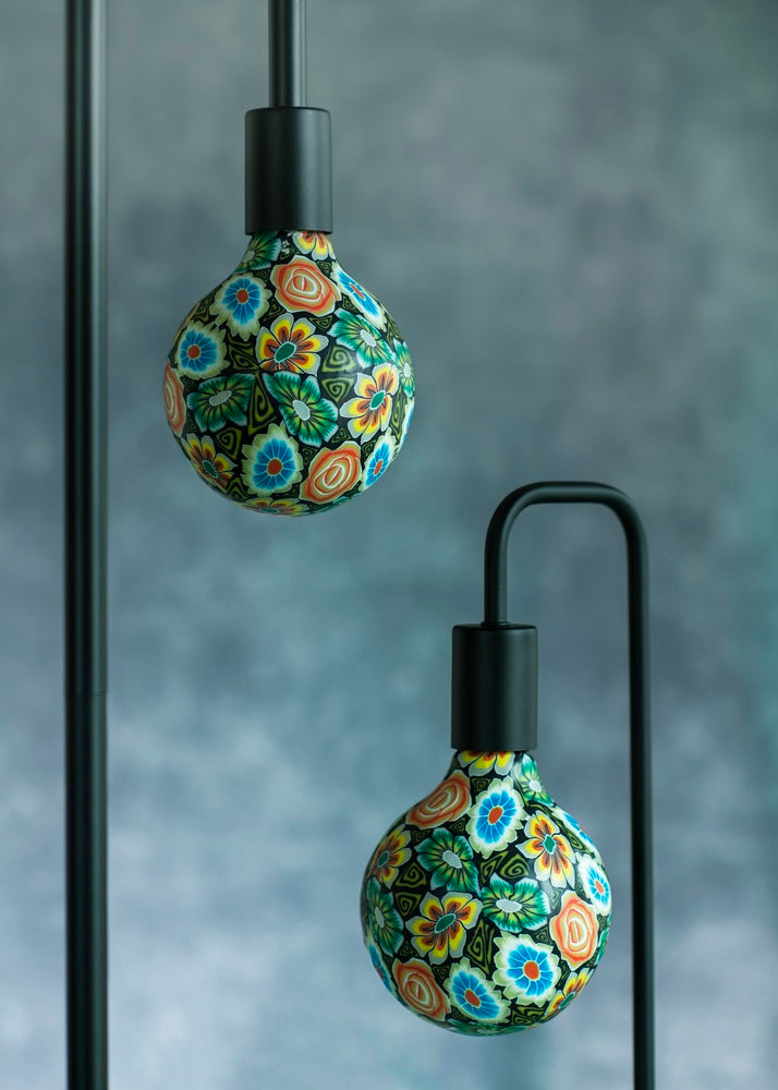 Lampe globe à filament LED artistique avec une surface en verre peint et un design de fleur sombre. Cette ampoule retrofit E27 produit 100 lumens à 1900K, fonctionnant à 230-240V avec une distribution de lumière à 360°. L'ampoule décorative de 125x175mm allie efficacité énergétique et esthétique contemporaine, créant une déclaration visuelle qu'elle soit illuminée ou non.