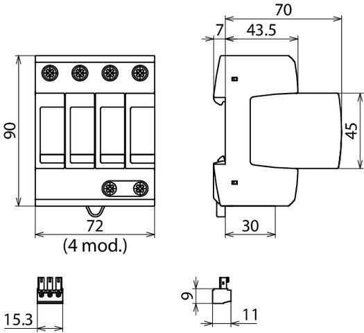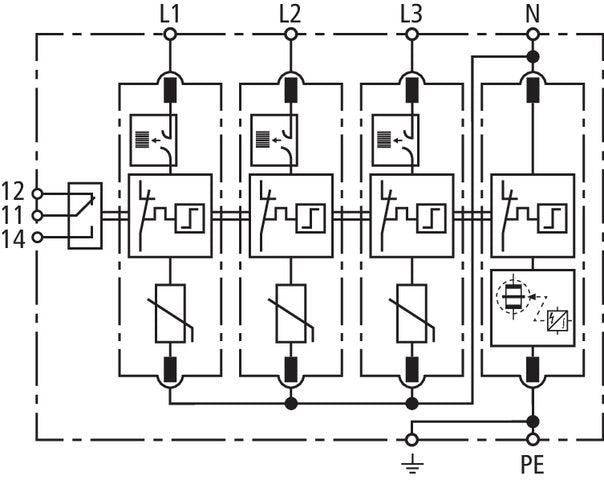Parafoudre Dehn DEHNguard M, design pôles 3+N/PE, réseau forme TT, avec contact de signalisation, rail DIN 35mm, max. Tension continue AC 275V, réseau forme TT, 4 conducteurs (sans terre), degré de protection (IP) IP20, DIN taille 4 TE (Grid size), résistant aux courts-circuits, résistance aux courts-circuits (Isccr) 25kA.