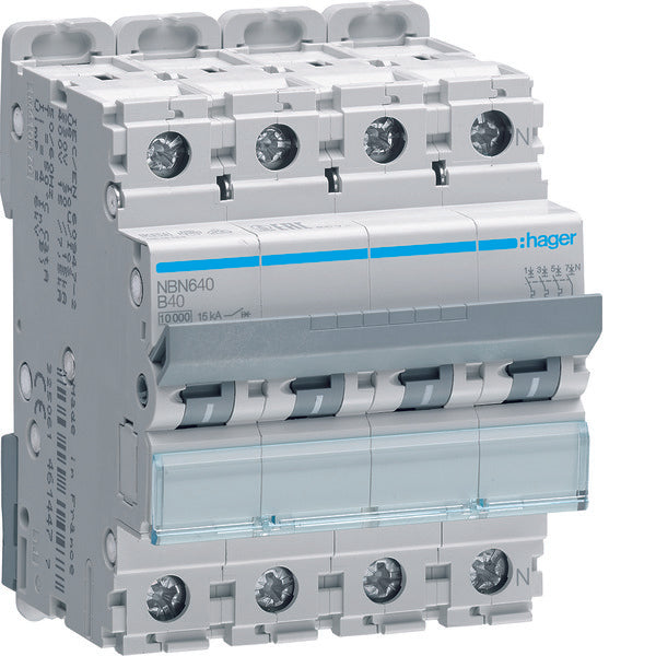 Hager NBN B-Caractéristique 3P + N disjoncteur, caractéristique de déclenchement B, neutre de raccordement, courant nom. (mesure) courant 40A, tension type AC, 4 pôles (total), largeur en unités modulaires 4, dispositif secondaire possible, section du conducteur raccordable 1 - 35mm², 3 pôles protégés.