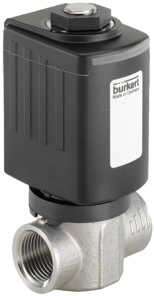 Électrovanne 2/2 voies Burkert (type 6240) avec filetage G 3/8 pouces et une bobine 24 V CC. La fonction de circuit de l'électrovanne est normalement fermée (tension = ouverte). La vanne fonctionne en semi-direct, donc aucune pression différentielle n'est requise. Convient pour des températures maximales des médias de 140 °C (284 °F) et une plage de pression de 0 à 16 bar (232 psi). Boîtier en acier inoxydable avec joint FKM et un diamètre d'orifice de 6 mm. La valeur Kv est de 0,6 m3/h (10,0 l/min à dp = 1 bar d'eau).