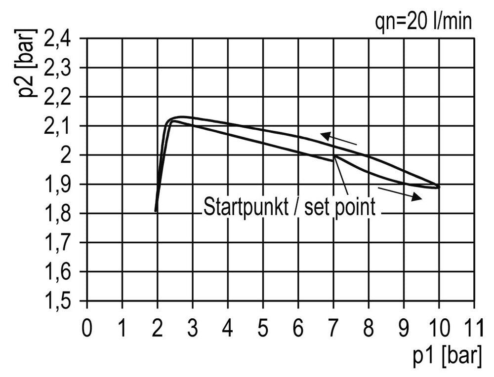 Ce filtre régulateur (FR) combine deux fonctions. Le filtre élimine l'eau, la saleté et les autres particules nocives de plus de 40 microns. Le régulateur de pression ajuste la pression en permanence à un niveau stable, même lorsque la pression d'entrée varie. Le niveau peut être réglé entre 0,5 et 10,0 bars (7 à 145 psi). Ce modèle possède des ports G 1 pouce. Le débit maximal est de 12000 l/min. Veuillez noter que le débit maximal seul ne fournit pas suffisamment d'informations pour un dimensionnement correct. Utilisez la courbe de débit pour déterminer si la chute de pression (droop) dans votre plage de débit prévue est acceptable. La courbe de débit montre le débit pour une pression d'entrée définie avec plusieurs pressions de sortie. Pour chaque pression de sortie, on peut voir comment la pression change avec l'augmentation du débit. Il est recommandé d'utiliser l'appareil dans la zone plate de la courbe, et non au début ou à la fin de la courbe. Notez que le régulateur de pression contrôle la pression de sortie, et non le débit. La pression de sortie peut être réglée en tirant le volant vers le haut et en le tournant.