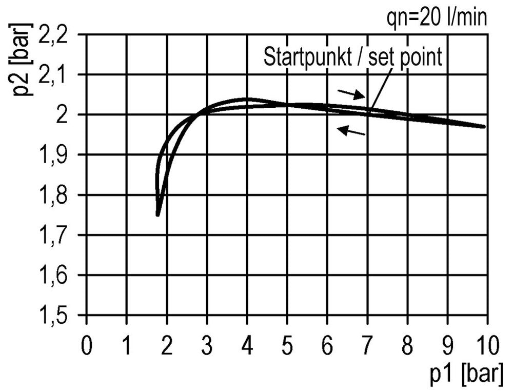 Ce filtre régulateur (FR) combine deux fonctions. Le filtre élimine l'eau, la saleté et les autres particules nocives de plus de 5 microns. Le régulateur de pression ajuste la pression en permanence à un niveau stable, même lorsque la pression d'entrée varie. Le niveau peut être réglé entre 0,5 et 10,0 bars (7 à 145 psi). Ce modèle est doté de ports G 1/2 pouce. Le débit maximal est de 5200 l/min. Veuillez noter que le débit maximal seul ne fournit pas suffisamment d'informations pour un dimensionnement correct. Utilisez la courbe de débit pour déterminer si la chute de pression (droop) dans votre plage de débit prévue est acceptable. La courbe de débit montre le débit pour une pression d'entrée définie avec plusieurs pressions de sortie. Pour chaque pression de sortie, on peut voir comment la pression change avec l'augmentation du débit. Il est recommandé d'utiliser l'appareil dans la zone plate de la courbe, et non au début ou à la fin de la courbe. Notez que le régulateur de pression contrôle la pression de sortie, et non le débit. La pression de sortie peut être réglée en tirant le volant vers le haut et en le tournant. Il peut être verrouillé après le réglage en repoussant le volant à main.