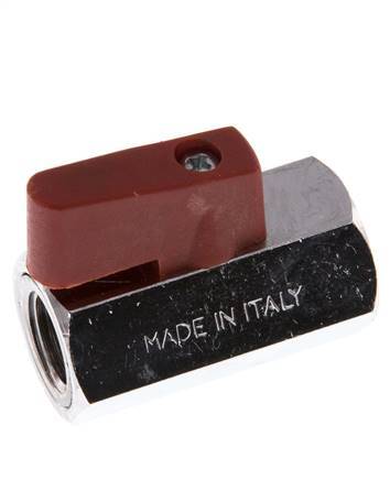 Mini-robinet à boisseau sphérique à 2 voies avec filetage femelle G1/4 pouce et poignée pour le contrôle du débit on/off. 8 mm de diamètre nominal et une pression de fonctionnement maximale allant jusqu'à 15 bar (218 psi). Par exemple, eau, huile, air comprimé, etc. La vanne est également adaptée au vide (max. -0,9 bar ou -13 psi). La plage de température est comprise entre -0 et 90 °C (-32 et 194 °F). Boule en laiton nickelé chromé dur et joints en PTFE/NBR.