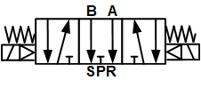 Une vanne 5/3 a cinq orifices et trois positions. La position centrale (de repos) peut avoir differentes fonctions ; dans le cas d'une vanne à "centre ferme", les cinq orifices sont fermes en position centrale. Les deux autres positions sont contrôlees par leur propre bobine de solenoïde. Ces positions sont utilisees pour alimenter l'orifice A et ventiler l'orifice B, ou l'inverse. Si aucune des deux bobines n'est activee, la valve revient en position centrale (mono-stable). Ce distributeur peut par exemple être utilise pour commander un verin à double effet, avec la possibilite de bloquer le verin dans des positions intermediaires. En activant l'une des deux bobines, le cylindre peut être deplace dans deux directions. La figure ci-dessous montre un schema de la fonction du circuit d'une vanne à 5/3 voies fermee au centre.