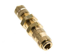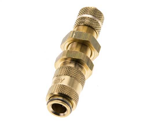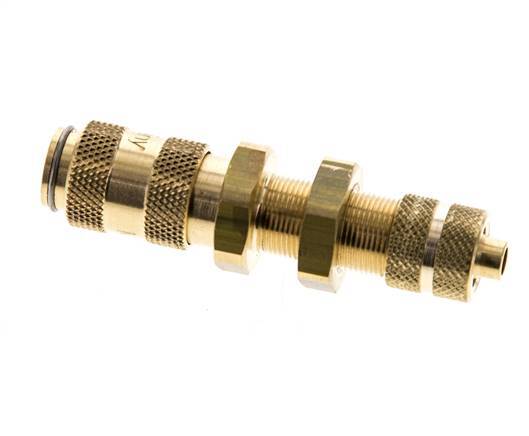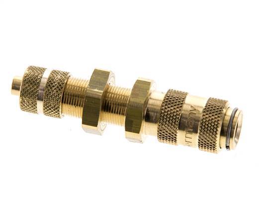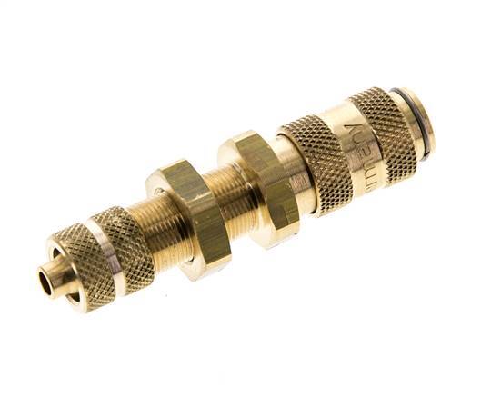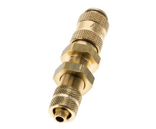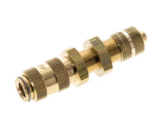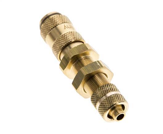 Manchon d'accouplement en laiton DN 2.7 (micro) avec écrou-raccord pour tuyaux de 4x6 mm et filetage de cloison. Un raccord pneumatique est utilisé pour connecter des outils à air comprimé à une ligne d'air comprimé. Le raccord nécessite deux parties : la douille (partie femelle) et la fiche ou le mamelon (partie mâle). Lorsqu'il est déconnecté, le raccord s'arrête automatiquement pour maintenir la pression de la ligne.