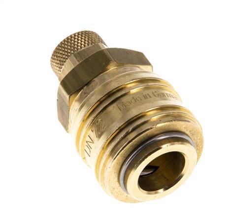 Manchon d'accouplement en laiton DN 7.2 (Euro) avec écrou-raccord pour tuyaux de 6x8 mm. Un raccord pneumatique est utilisé pour connecter des outils à air comprimé à une ligne d'air comprimé. Le raccord nécessite deux parties : la douille (partie femelle) et la fiche ou le mamelon (partie mâle). Lorsqu'il est déconnecté, le raccord s'arrête automatiquement pour maintenir la pression de la ligne.