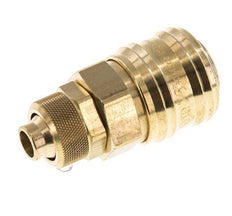 Manchon d'accouplement en laiton DN 7.2 (Euro) avec écrou-raccord pour tuyaux de 9x12 mm. Un raccord pneumatique est utilisé pour connecter des outils à air comprimé à une ligne d'air comprimé. Le raccord nécessite deux parties : la douille (partie femelle) et la fiche ou le mamelon (partie mâle). Lorsqu'il est déconnecté, le raccord s'arrête automatiquement pour maintenir la pression de la ligne.