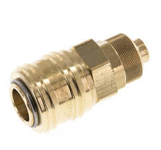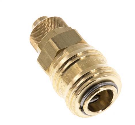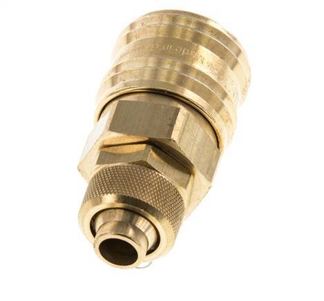 Manchon d'accouplement en laiton DN 7.2 (Euro) avec écrou-raccord pour tuyaux de 9x12 mm. La prise est dotée d'un système de fermeture à double face. La plage de pression de fonctionnement s'étend de -0,95 (adapté aux vides) à 35 bar. Convient pour des températures comprises entre -20 et 100 degrés Celsius. Le débit est de 800 l/min. Le matériau des joints est le NBR (caoutchouc nitrile).