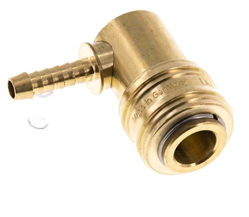 Prise d'air en laiton DN 7.2 (Euro) avec une connexion de 6 mm pour le pilier du tuyau. La colonne de tuyau est à un angle de 90°. Un raccord pneumatique est utilisé pour connecter des outils à air comprimé à une ligne d'air comprimé. Le raccord nécessite deux parties : la douille (partie femelle) et la fiche ou le mamelon (partie mâle). Lorsqu'il est déconnecté, le raccord s'arrête automatiquement pour maintenir la pression de la ligne.