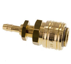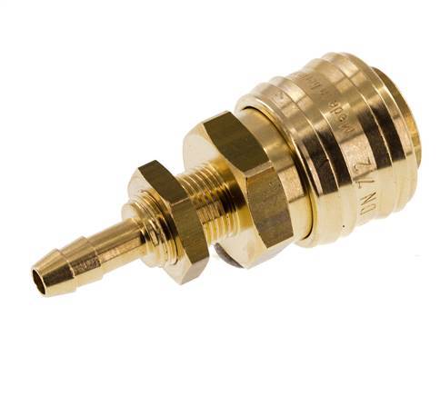 Prise d'air en laiton DN 7.2 (Euro) avec un raccord de colonne de tuyau de 6 mm et un filetage de cloison. La plage de pression de fonctionnement s'étend de -0,95 (adapté aux vides) à 35 bar. Convient pour des températures comprises entre -20 et 100 degrés Celsius. Le débit est de 1100 l/min. Le matériau des joints est le NBR (caoutchouc nitrile).