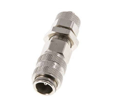Manchon de raccordement d'air DN 5 en laiton nickelé avec écrou-raccord pour tuyaux de 6x8 mm et filetage de cloison. Un raccord pneumatique est utilisé pour connecter rapidement des outils pneumatiques à une conduite d'air comprimé. Le coupleur se compose de deux parties : la douille (partie femelle) et la fiche ou le mamelon (partie mâle). Lorsqu'il est déconnecté, le coupleur s'arrête automatiquement pour maintenir la pression de la ligne.