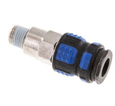 Le filetage mâle R 1/4 pouce permet de le visser sur une pièce filetée femelle correspondante. Ce coupleur est adapté aux applications sous vide. La douille est dotée d'un système de verrouillage à bille durable. La plage de pression de fonctionnement s'étend de -0,95 à 35 bars. La prise est adaptée à des températures comprises entre -20 et 80°C. Le débit nominal est de 2100 l/min. Le matériau d'étanchéité est le NBR (caoutchouc nitrile). Le matériau du manchon est en plastique. Le boîtier en laiton nickelé a une protection de surface nickelée.