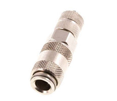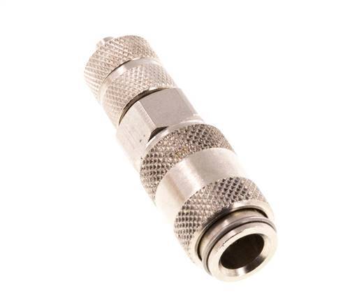 Manchon de raccordement à l'air DN 2,7 (micro) en laiton nickelé avec écrou-raccord pour tuyaux de 3x4,3 mm. Un raccord pneumatique est utilisé pour connecter rapidement des outils pneumatiques à une conduite d'air comprimé. Le coupleur se compose de deux parties : la douille (partie femelle) et la fiche ou le mamelon (partie mâle). Lorsqu'il est déconnecté, le coupleur s'arrête automatiquement pour maintenir la pression de la ligne.