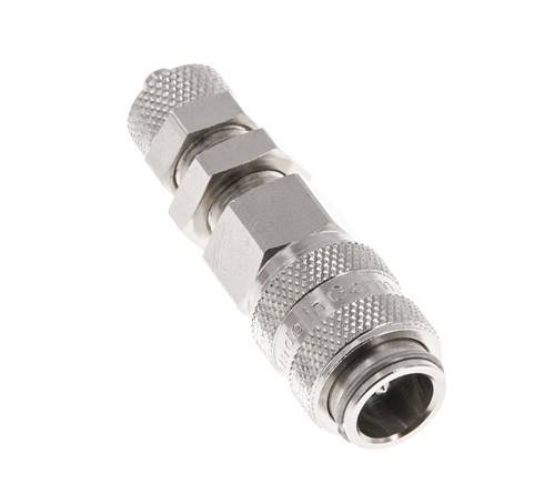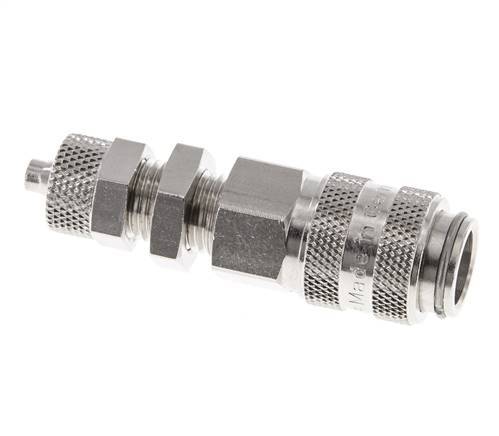 Manchon de raccordement d'air DN 5 en laiton nickelé avec écrou-raccord pour tuyaux de 4x6 mm et filetage de cloison. Un raccord pneumatique est utilisé pour connecter rapidement des outils pneumatiques à une conduite d'air comprimé. Le coupleur se compose de deux parties : la douille (partie femelle) et la fiche ou le mamelon (partie mâle). Lorsqu'il est déconnecté, le coupleur s'arrête automatiquement pour maintenir la pression de la ligne.