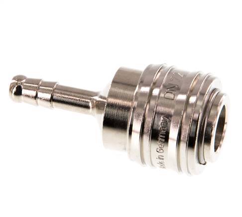 Fixez facilement un tuyau sur la colonne de tuyau de 6 mm. En option, commandez un collier de serrage pour une bonne fixation du tuyau. Ce coupleur est adapté aux applications sous vide. La prise est munie d'un dispositif d'obturation à double face. Ils peuvent être utilisés avec des fiches normales et avec des fiches à double obturation. Lorsque les bouchons d'obturation double face sont déconnectés, ils bloquent l'écoulement dans les deux sens. La plage de pression de fonctionnement s'étend de -0,95 à 35 bars. La prise est adaptée à des températures comprises entre -20 et 100°C. Le débit nominal est de 800 l/min. Le matériau d'étanchéité est le NBR (caoutchouc nitrile). Le boîtier en laiton nickelé a une protection de surface nickelée. Ce DN 7,2 mm a un profil européen et est populaire en Europe.