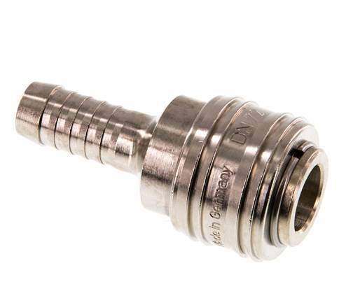 Fixez facilement un tuyau sur la colonne de tuyau de 10 mm. En option, commandez un collier de serrage pour une bonne fixation du tuyau. Ce coupleur est adapté aux applications sous vide. La plage de pression de fonctionnement s'étend de -0,95 à 35 bars. La prise est adaptée à des températures comprises entre -20 et 100°C. Le débit nominal est de 1100 l/min. Le matériau d'étanchéité est le NBR (caoutchouc nitrile). Le boîtier en laiton nickelé a une protection de surface nickelée. Ce DN 7,2 mm a un profil européen et est populaire en Europe.