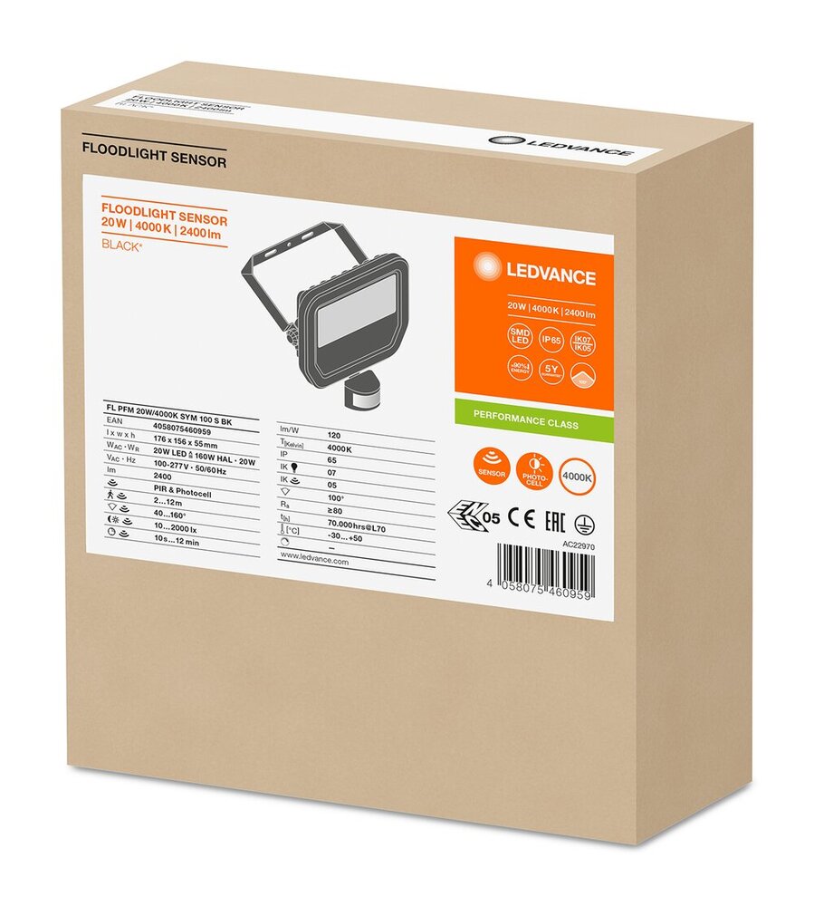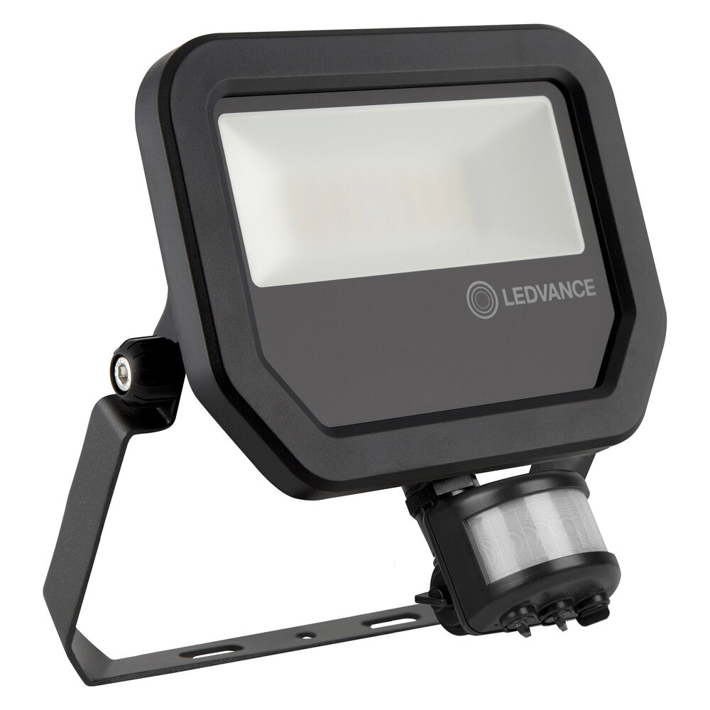 Ledvance Floodlight Sensor downlight/spot/spotlight, sous-catégorie projecteur, flux lumineux 2400lm, flux lumineux effectif selon IEC 2400lm, température 4000K, couleur de lumière blanche, convient pour puissance de lampe 20W, puissance de système 20W, boîtier noir, degré de protection (IP) IP65, avec détecteur de mouvement.
