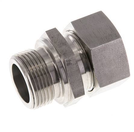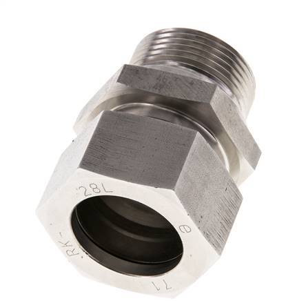 Ce raccord droit à visser est conçu avec des filets mâles et un raccord à bague coupante. Le raccord 2 est une bague coupante de 28 mm. Il s'agit d'un raccord droit. Il est fabriqué en acier inoxydable (1.4571). Il convient aux milieux situés dans une plage de températures allant de -60 °C à 400 °C (-76 °F à 752 °F). À 20 °C (68 °F), il peut supporter une pression maximale de 160 bars (2321 psi). Selon la norme DIN 2353, il est classé dans la catégorie de charge L (légère). Il est fabriqué conformément à la norme DIN EN ISO 8434-1 (DIN 2353). Ils sont conçus en trois parties.