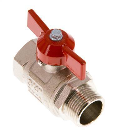 Vanne à boisseau sphérique à 2 voies de conception courte avec des ports G/G 3/4 pouces mâle et femelle et une poignée papillon pour le contrôle du débit. L'alésage de la valve est de 20 mm et la pression maximale est de 40 bar ou 580 psi. Convient pour l'eau, les milieux liquides neutres, gazeux et non agressifs, les huiles minérales et l'air comprimé. La vanne est également adaptée au vide (max. -0,9 bar ou -13 psi). Convient pour des températures de -20 à 150 °C (-4 à 302 °F). Boîtier en laiton nickelé, bille en laiton chromé et joints en PTFE/FKM.