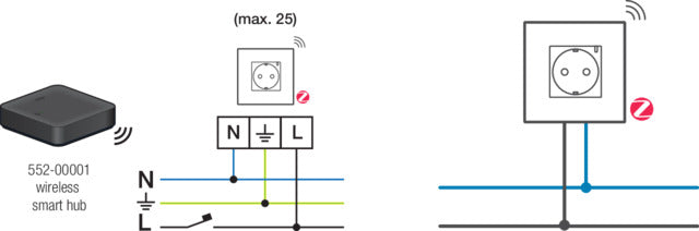 A ZigBee-enabled smart socket that wirelessly connects to the Niko Home Control hub for remote switching and power monitoring. Features built-in overcurrent protection and consumption measurement viewable through the Niko Home app. Compatible with both wireless and bus wiring installations, it enables automated routines including all-off/all-on functions and calendar-based control while maintaining functionality as a standard socket outlet.