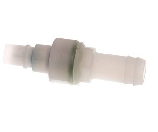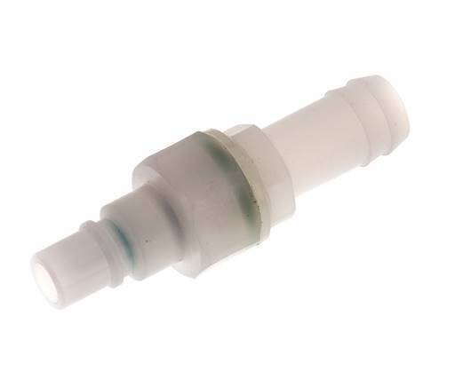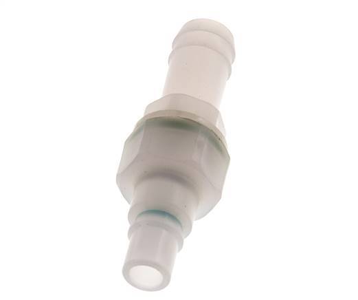 Connecteur de couplage en fluorure de polyvinylidène (PVDF) DN 7.2 avec pilier de tuyau de 13 mm. Le couplage dispose d'un clapet anti retour pour éviter le reflux et la prise push-in se ferme également lorsqu'elle est déconnectée. La plage de pression de fonctionnement est de 0 à 8 bar (0 à 116 psi). Le couplage est adapté à des températures comprises entre -20 et 120 °C (-4 à 248 °F).