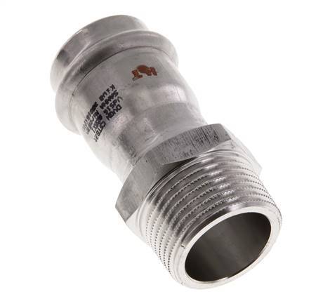 Il s'agit d'un raccord à sertir droit en acier inoxydable 1.4404. Le raccord est dote d'un orifice femelle à presser et d'un orifice mâle filete. Le raccord 1 est conçu pour un tube d'un diamètre exterieur de 28 mm et le raccord 2 est dote d'un filetage mâle R 1 pouce. Le raccord est muni d'une bague d'etancheite en FKM. La pression maximale est de 25 bars (363 psi). Le raccord convient pour des temperatures allant de -20 à 200 °C (-4 à 392 °F). Temporaire, la temperature maximale peut atteindre +280 °C (536 °F). La longueur du raccord est de 74 mm.