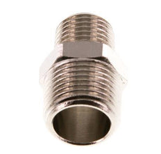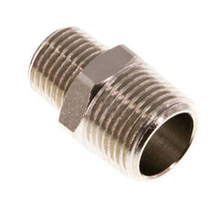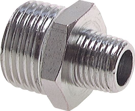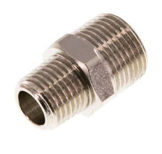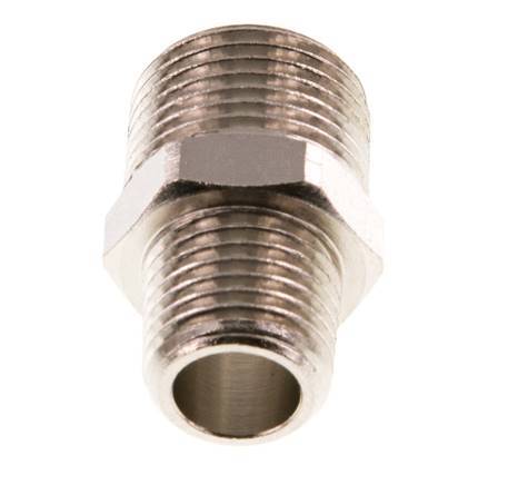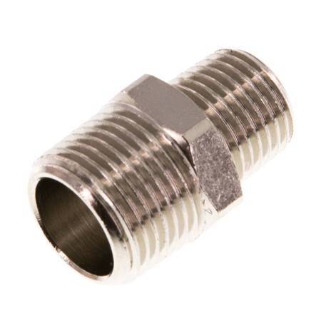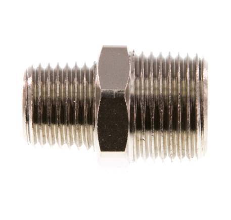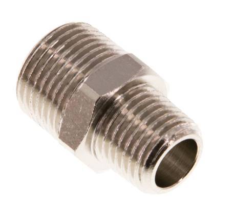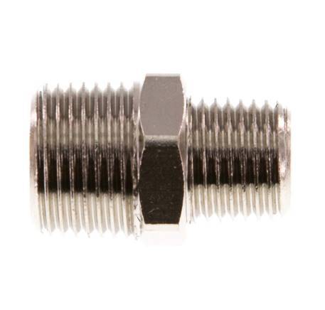 Ce mamelon double est conçu avec un filetage mâle à mâle. Le raccord 1 a un filetage R 3/8 pouce. Le raccord 2 a un filetage R 1/4 pouce. Il s'agit d'un raccord droit. Il est fabriqué en laiton et est nickelé pour protéger la surface. À 20 °C (68 °F), il peut supporter une pression maximale de 16 bars (232 psi).