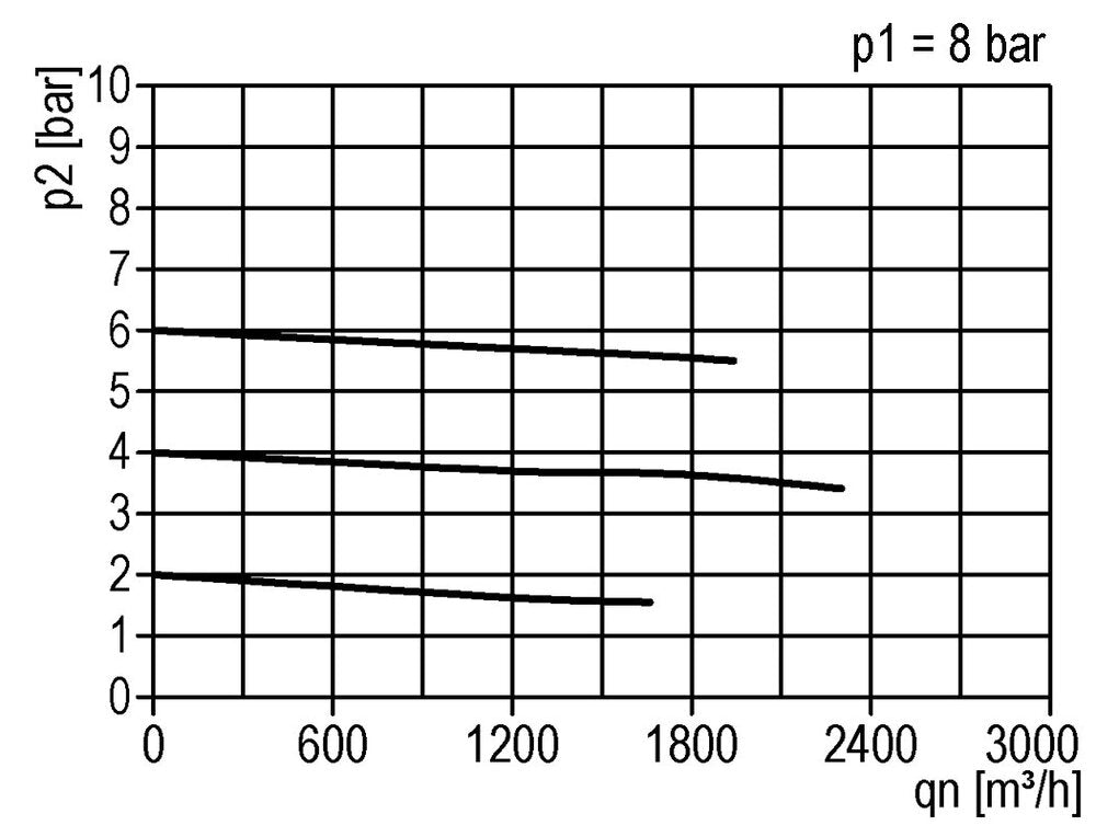 Le régulateur de pression ajuste la pression en permanence à un niveau stable, même lorsque la pression d'entrée varie. Le niveau peut être réglé entre 0,5 et 10,0 bars (7 à 145 psi). Ce modèle dispose de G ports de 1 1/4 pouce. Le débit maximal est de 31500 l/min. Veuillez noter que le débit maximal seul ne fournit pas suffisamment d'informations pour un dimensionnement correct. Utilisez la courbe de débit pour déterminer si la chute de pression (droop) dans votre plage de débit prévue est acceptable. La courbe de débit montre le débit pour une pression d'entrée définie avec plusieurs pressions de sortie. Pour chaque pression de sortie, on peut voir comment la pression change avec l'augmentation du débit. Il est recommandé d'utiliser l'appareil dans la zone plate de la courbe, et non au début ou à la fin de la courbe. Notez que le régulateur de pression contrôle la pression de sortie, et non le débit. La pression de sortie peut être réglée en tirant le volant vers le haut et en le tournant. Il peut être verrouillé après le réglage en repoussant le volant à main.