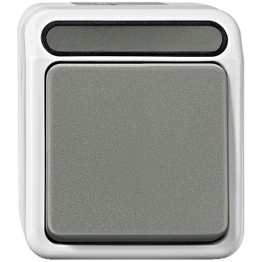 Ce commutateur de la série Aquastar de Schneider Electric Merten est résistant aux chocs et se fixe par vis. Ce commutateur permet de commander un point lumineux à deux endroits. L'ensemble de l'interrupteur est étanche aux éclaboussures et à la poussière, ce qui permet de l'utiliser aussi bien à l'intérieur qu'à l'extérieur. Le boîtier de cet inverseur est de couleur gris clair et le bouton de commande est de couleur gris foncé.