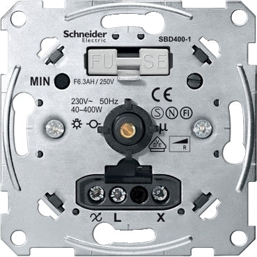 Ce variateur de Schneider Electric Merten convient à la commutation et à la gradation de lampes à incandescence d'une puissance maximale de 400 W (charge minimale de 40 W). Le variateur s'allume facilement en appuyant sur le bouton et se contrôle en tournant le bouton. En outre, le variateur est doté d'une protection contre les courts-circuits et d'une protection électronique contre les surtensions. En outre, le gradateur Merten de Schneider Electric est fixé au moyen de bornes à vis. Ce variateur peut être équipé de l'un des capots suivants : M bouton rotatif MTN5250-03. / -04. Bouton rotatif de conception du système MTN5250-40. / -41.
