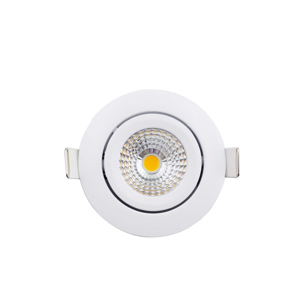 Spot LED encastré rond avec capacité de gradation DALI et positionnement ajustable. Émet 450 lumens à 5 watts avec une température de couleur blanc chaud de 2700K. Dispose d'un angle de faisceau de 60 degrés et de dimensions compactes avec un diamètre de découpe de 68 mm et un diamètre extérieur de 82 mm. Idéal pour les installations d'éclairage professionnelles nécessitant un contrôle précis.