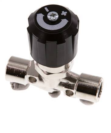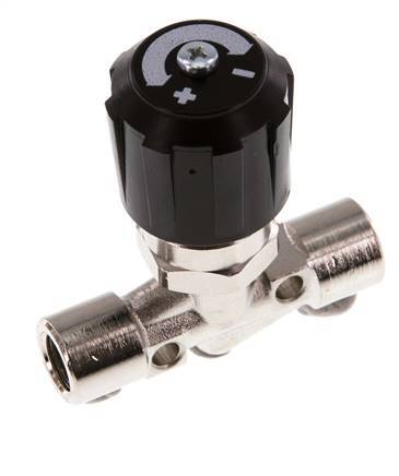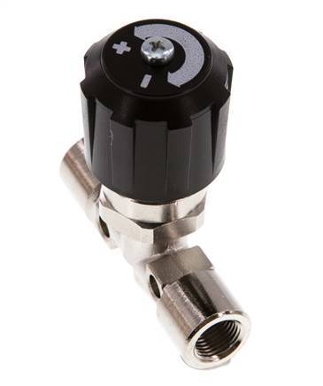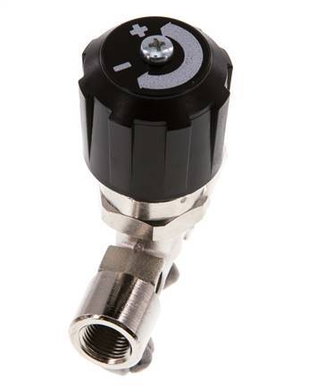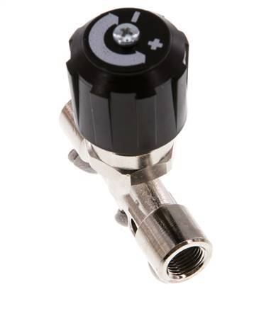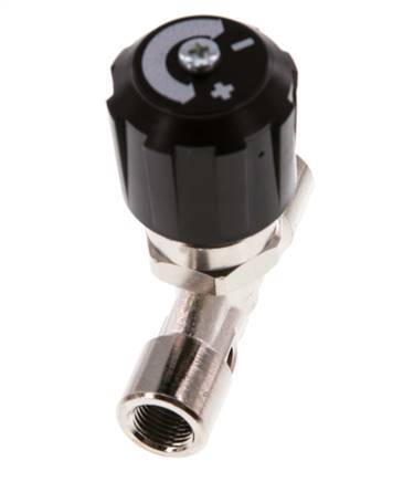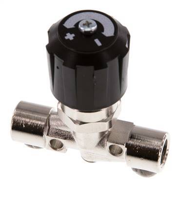 Vanne à aiguille très compacte en laiton nickelé avec filetage G 1/8". Cette vanne peut être utilisée comme une vanne d'arrêt fiable, ou pour contrôler avec précision les débits (relativement faibles) de gaz ou de fluides propres. La valve a un diamètre interne nominal de 4 mm. Les joints sont en NBR. La pression maximale est de 18 bars et la plage de température admissible est de -10 à max. 80°C. La vanne peut être montée directement sur un panneau (trou Ø 14,5 mm).